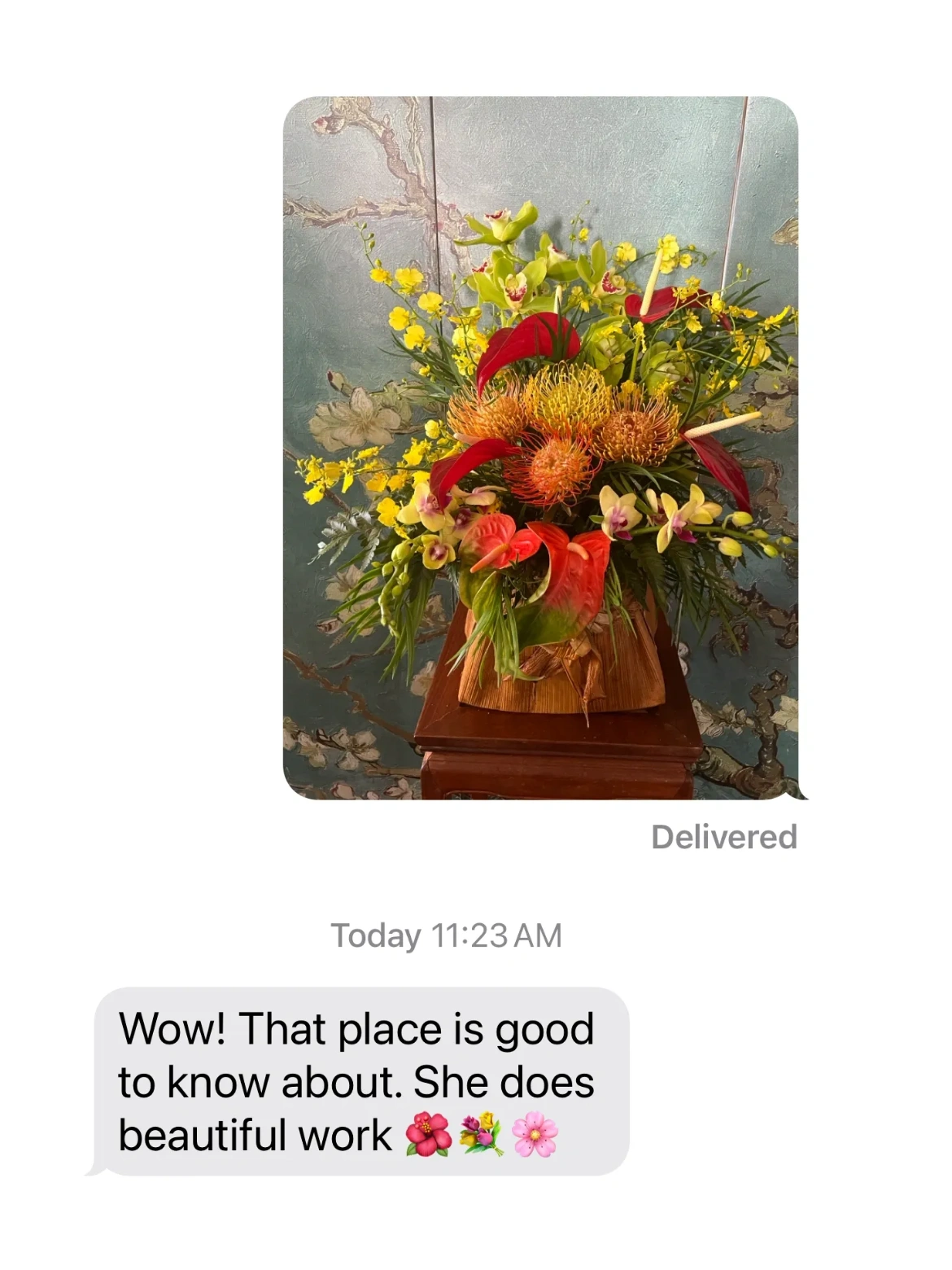 "Evelyn made the process of ordering and delivery her beautiful flower arrangement so easy! She went above and beyond to make sure it was great! My niece and her mom loved the arrangement and said it makes them happy every time the look at it which helps in their grief! They lost their love and Hawaii lost an institution…Coach Wags!" ~ AJ